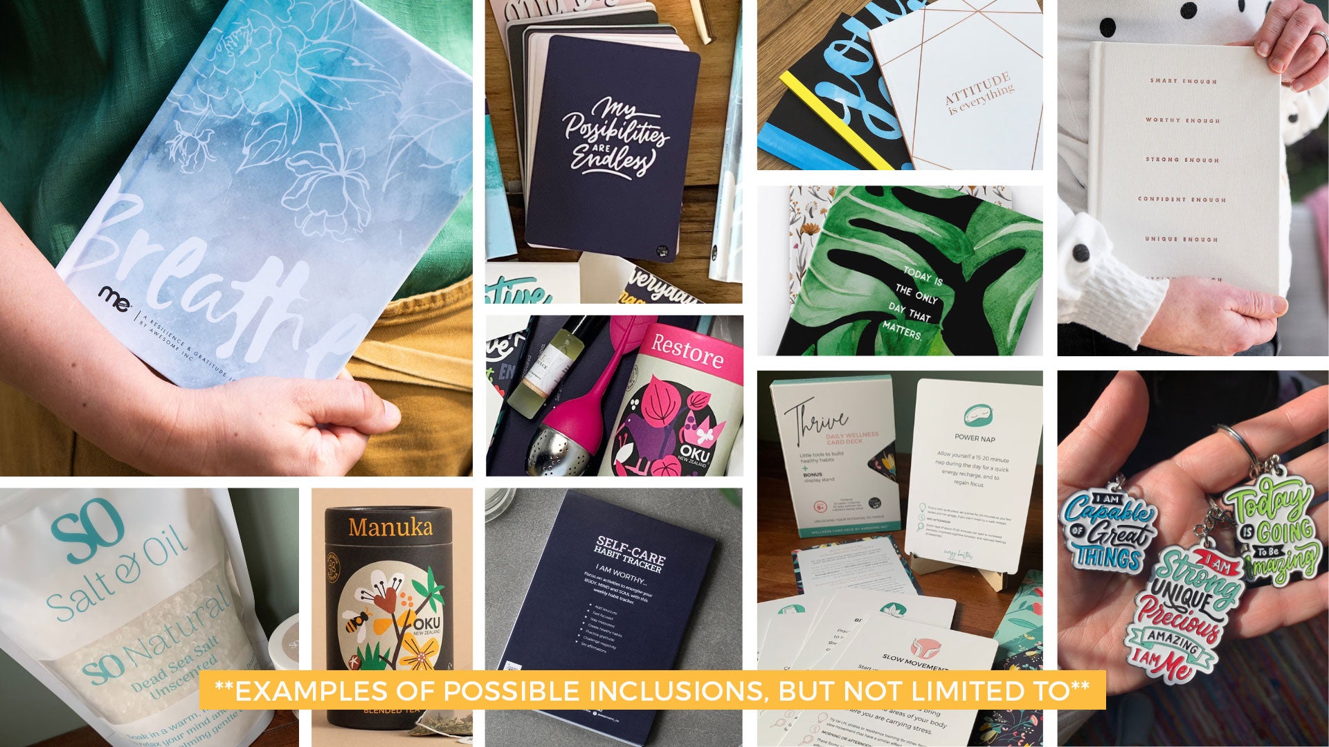 Crafted with care, each box offers a combination of goodies perfect to help you reflect, wind down and pamper. All boxes will contain a gratitude or mindset journal and other possible inclusions such as herbal tea with infuser, bath soak, card set, notepad, pen, stickers... Let us know in the checkout comments who you are buying for and we will choose accordingly.